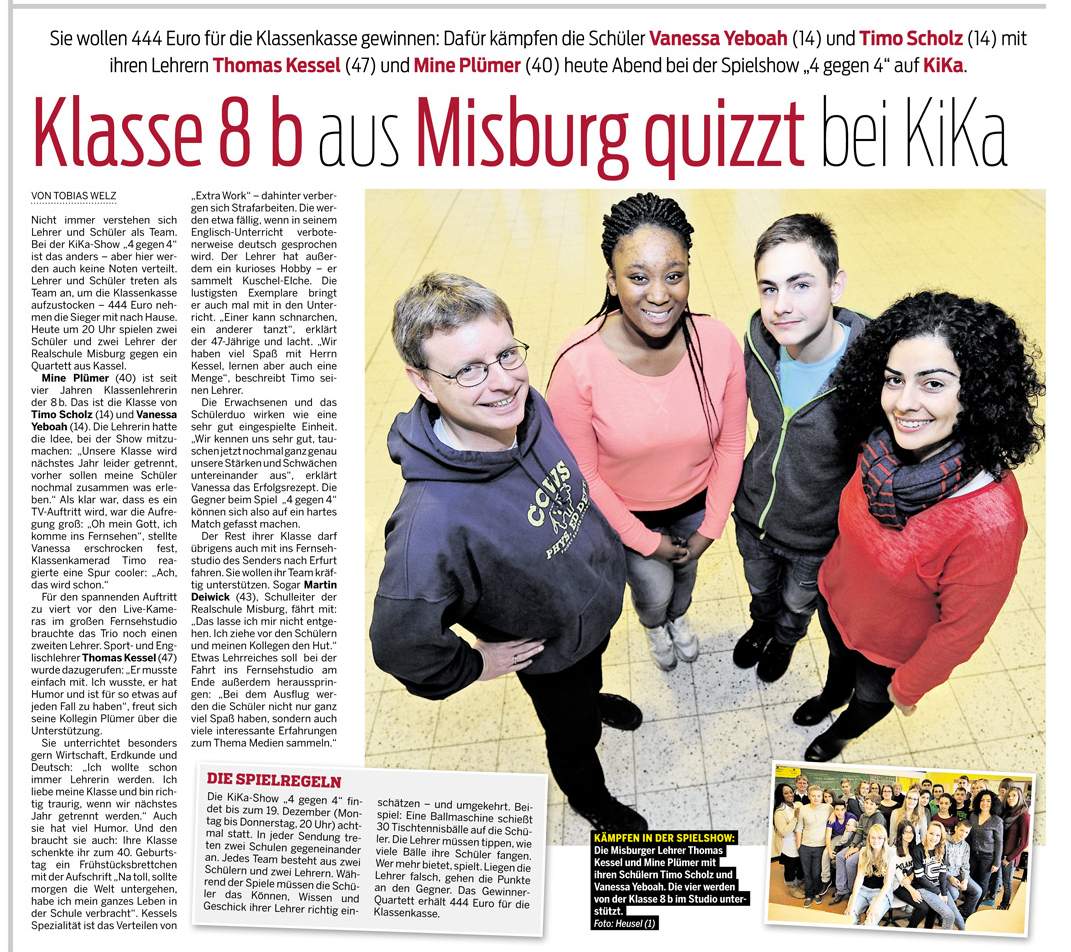 Nicht immer verstehen sich Lehrer und Schüler als Team. Bei der KiKa-Show „4 gegen 4“ ist das anders – aber hier werden auch keine Noten verteilt. Lehrer und Schüler treten als Team an, um die Klassenkasse aufzustocken – 444 Euro nehmen die Sieger mit nach Hause. Heute um 20 Uhr spielen zwei Schüler und zwei Lehrer der Realschule Misburg gegen ein Quartett aus Kassel. Mine Plümer (40) ist seit vier Jahren Klassenlehrerin der 8b. Das ist die Klasse von Timo Scholz (14) und Vanessa Yeboah (14). Die Lehrerin hatte die Idee, bei der Show mitzumachen: „Unsere Klasse wird nächstes Jahr leider getrennt, vorher sollen meine Schüler nochmal zusammen was erleben.“ Als klar war, dass es ein TV-Auftritt wird, war die Aufregung groß: „Oh mein Gott, ich komme ins Fernsehen“, stellte Vanessa erschrocken fest, Klassenkamerad Timo reagierte eine Spur cooler: „Ach, das wird schon.“ Für den spannenden Auftritt zu viert vor den Live-Kameras im großen Fernsehstudio brauchte das Trio noch einen zweiten Lehrer. Sport- und Englischlehrer Thomas Kessel (47) wurde dazugerufen: „Er musste einfach mit. Ich wusste, er hat Humor und ist für so etwas auf jeden Fall zu haben“, freut sich seine Kollegin Plümer über die Unterstützung. Sie unterrichtet besonders gern Wirtschaft, Erdkunde und Deutsch: „Ich wollte schon immer Lehrerin werden. Ich liebe meine Klasse und bin richtig traurig, wenn wir nächstes Jahr getrennt werden.“ Auch sie hat viel Humor. Und den braucht sie auch: Ihre Klasse schenkte ihr zum 40. Geburtstag ein Frühstücksbrettchen mit der Aufschrift „Na toll, sollte morgen die Welt untergehen, habe ich mein ganzes Leben in der Schule verbracht“. Kessels Spezialität ist das Verteilen von „Extra Work“ – dahinter verbergen sich Strafarbeiten. Die werden etwa fällig, wenn in seinem Englisch-Unterricht verbotenerweise deutsch gesprochen wird. Der Lehrer hat außerdem ein kurioses Hobby – er sammelt Kuschel-Elche. Die lustigsten Exemplare bringt er auch mal mit in den Unterricht. „Einer kann schnarchen, ein anderer tanzt“, erklärt der 47-Jährige und lacht. „Wir haben viel Spaß mit Herrn Kessel, lernen aber auch eine Menge“, beschreibt Timo seinen Lehrer. Die Erwachsenen und das Schülerduo wirken wie eine sehr gut eingespielte Einheit. „Wir kennen uns sehr gut, tauschen jetzt nochmal ganz genau unsere Stärken und Schwächen untereinander aus“, erklärt Vanessa das Erfolgsrezept. Die Gegner beim Spiel „4 gegen 4“ können sich also auf ein hartes Match gefasst machen. Der Rest ihrer Klasse darf übrigens auch mit ins Fernsehstudio des Senders nach Erfurt fahren. Sie wollen ihr Team kräftig unterstützen. Sogar Martin Deiwick (43), Schulleiter der Realschule Misburg, fährt mit: „Das lasse ich mir nicht entgehen. Ich ziehe vor den Schülern und meinen Kollegen den Hut.“ Etwas Lehrreiches soll bei der Fahrt ins Fernsehstudio am Ende außerdem herausspringen: „Bei dem Ausflug werden die Schüler nicht nur ganz viel Spaß haben, sondern auch viele interessante Erfahrungen zum Thema Medien sammeln.“
