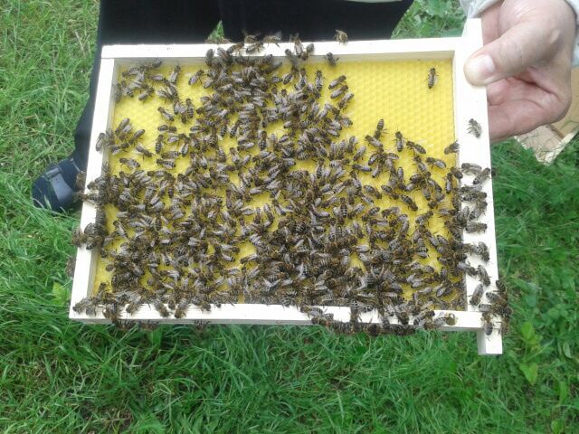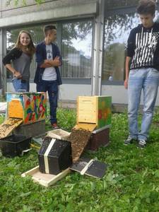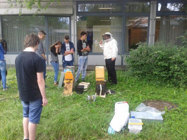 Sollten sich mal ein paar Bienen in das Schulgebäude verirren, kann man sie mit einer Zuckerlösung in einem Becher oder auf der Hand nach draußen transportieren. Auch tote Bienen können jetzt vermehrt auftreten, denn alle "Arbeitsbienen" haben eine Lebenserwartung von ca. 40 Tagen. Wenn noch jemand Fragen hat, kann Frau Heide gerne weitere Infos geben oder bei Interesse auch mal die Kästen öffnen. Gestern war die 8c mit von der Partie und obwohl alle Schüler in direkter Nähe waren - lebhaft, unruhig und auch mal kreischig- gab es zwar einige Bienenkontakte, aber keine Stiche.
