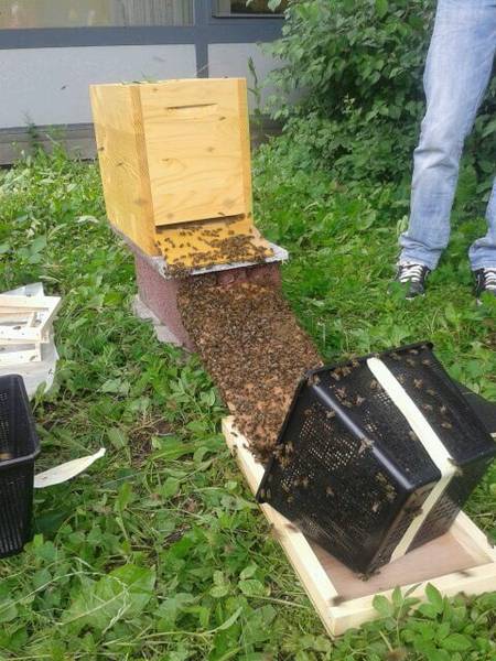 Freitag Mittag, den 13.06.2014, sind in der RS Misburg etwa 14000 friedliche Bienen eingezogen. Unsere neuen Mitbewohner sind sehr friedliebend und in den nächsten Tagen damit beschäftigt ihren Bienenstock wohnlich einzurichten, damit der Nachwuchs gedeihen kann. Deshalb brummt es zwar in den Kästen ziemlich stark, umherfliegen werden aber nur die "Kundschafter", um Wasser- und Nektarquellen im Umkreis von ca. 2 km zu finden. Damit die Arbeitsbienen, die männlichen Drohnen, die Torwächter und die Königin für Waben und Nachwuchs sorgen können, füttern wir im Moment noch eine Zuckerlösung zu. Später sorgen die fleißigen Bienen selber für ihre Nahrung - vielleicht fällt dann auch etwas für die Schule ab.