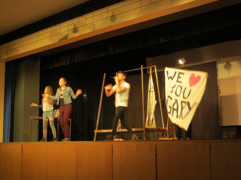 Der siebte und achte Jahrgang schaute sich eine Geschichte an, die von zwei Teenagern handelt, die die Schule schwänzen, um zu einem Konzert von ihrem Popidol Gary zu fahren ("We love Gary").