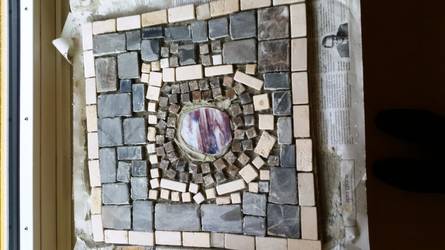 Am nächsten Morgen ging es dann mit dem Anrühren des Fliesenklebers weiter, der mit einer Zahnkelle großzügig aufgetragen wurde. Das Verlegen der Mosaiksteine konnte beginnen. Jetzt fehlte nur noch der Fugenmörtel und die Mosaikfliesen waren fertig.