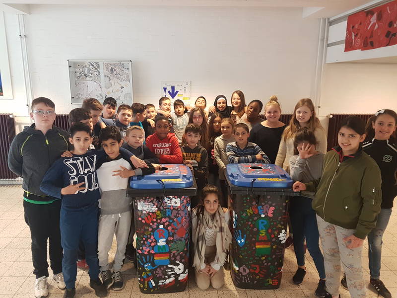 Zwei große schwarze Tonnen, ein Bohrer, eine Stichsäge, Acrylfarbe und Pinsel und schon legten die eifrigen Schülerinnen und Schüler los. Sie sägten und bohrten Löcher in die Deckel und gestalteten die Tonnen mit Handabdrücken in ihren Nationalitätenfarben kunterbunt.