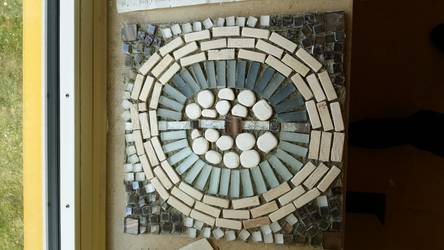Als erstes wurde in Kleingruppen mit den Mosaiksteinen eine Vorlage gelegt, so dass gegebenenfalls noch Veränderungen vorgenommen werden konnten.