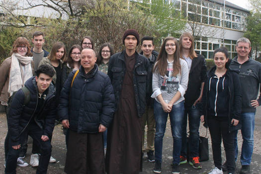Im Rahmen einer Unterrichtseinheit „Buddhismus“ hat der Werte und Normen-Kurs der Klasse 10 (bestehend aus 18 Schülerinnen und Schülern der 10b und einem Schüler der 10c) unter Leitung von Herrn Kessel das buddhistische Kloster Vien Giac in der Karlsruher Straße (Nähe Messegelände) besucht und sich unter anderem den großen Gebetssaal genauer zeigen lassen. In der Rückschau stellte die Lerngruppe fest, dass trotz intensiver Diskussionen und Erläuterungen weiterhin Fragen zum Buddhismus offen geblieben sind. Prompt hat der Fachlehrer reagiert und einen ehemaligen Studienkollegen, der nun tatsächlich Abt der zuvor besichtigten Pagode Vien Giac ist, Herrn Thich Hanh Gioi, kontaktiert. Dieser sagte prompt zu und besuchte am 14. April 2016 nicht nur den Kurs in der Schule, sondern brachte sogar einen Mönchsschüler, Herrn Dong Tin, mit. In einer Doppelstunde standen beide Mönche sämtlichen Fragen Rede und Antwort, wobei dies zwischenzeitlich auf Englisch stattfand, da der Mönchsschüler kein Deutsch sprach.