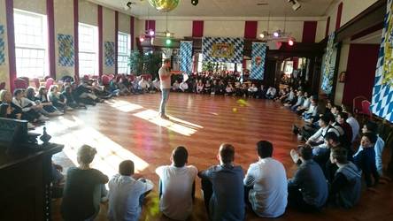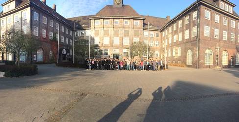 Fast einhundert Schülerinnen und Schüler, wie besprochen in bequemer aber gepflegter Kleidung, strömten uns pünktlich entgegen.