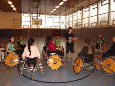 Am Freitag, den 3. November 2017, fand das Projekt „Sitzenbleiben erwünscht – Rollstuhlbasketball macht Schule“ des Rollstuhlbasketball - Bundesligavereins Hannover United statt. Ziele dieses Projektes sind u.a. die Zusammenführung von Menschen mit Behinderung und ohne Behinderung, die Schaffung eines inklusiven Sportangebots und die Sensibilisierung für die Leistungsfähigkeit von Menschen mit Behinderung. Unter der Leitung von Eike Gößling, der für den Bundesligisten Hannover United spielt, lernten die Schülerinnen und Schüler der Klasse 9d die Grundlagen des Rollstuhlbasketballs kennen. Nach einer Einführung ging es auch gleich zur Sache. Im Spiel „Rollstuhlkontaktticker“ mussten die Jugendlichen nun ihre Fähigkeiten im Rollstuhlfahren unter Beweis stellen. Die Fänger sollten versuchen, die anderen Rollstuhlfahrer zu „tickern“, also zu rammen. Befreit war man erst, wenn man von einem anderen Spieler wieder „freigetickert“ wurde. Dies machte den Schülerinnen und Schülern besonders viel Spaß. Das Dribbeln und die Aufnahme des Balles beim Fahren sowie das Werfen auf den Basketballkorb konnte in vorbereitenden Übungen für das Basketballspiel im Rollstuhl ausprobiert werden. Auf dem kompletten Basketballfeld konnten sich die Schülerinnen und Schüler im Spiel 6 gegen 6 dann noch einmal austoben und feststellen, dass es nicht so einfach ist, Basketball im Rollstuhl zu spielen. Die Klasse 9d wird am Sonntag, dem 19.11.2017 die Mannschaft von Hannover United beim Bundesligaspiel gegen den RSV Lahn Dill in der Sporthalle der IGS Stöcken anfeuern.
