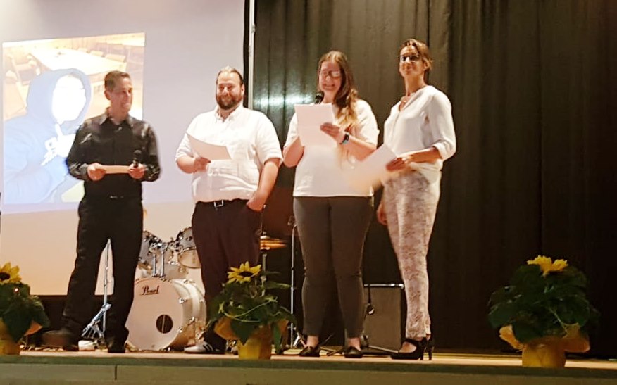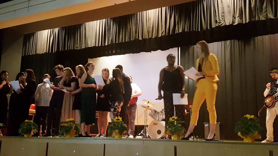 Mit einem lustigen Gedicht nahmen die vier Klassenlehrer/-innen in alphabetischer Reihenfolge Abschied von ihren Schülern. Im Anschluss bedankten sich noch die Klassensprecher/-innen im Namen ihrer Klassen bei ihren Lehrern und es erfolgte die Zeugnisausgabe.