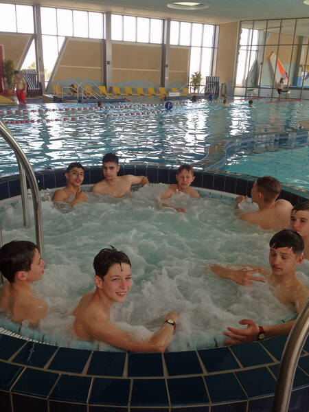 Nach dem Mittagessen haben wir uns dann auf den Weg zum Schwimmbad gemacht. Da gab es eine Rutsche, aber das spannendste war der „Flow- Rider“. Dort war eine starke Strömung und man konnte auf kleinen Surfboards versuchen, sich möglichst lange zu halten. Das haben auch einige von uns gut hingekriegt.