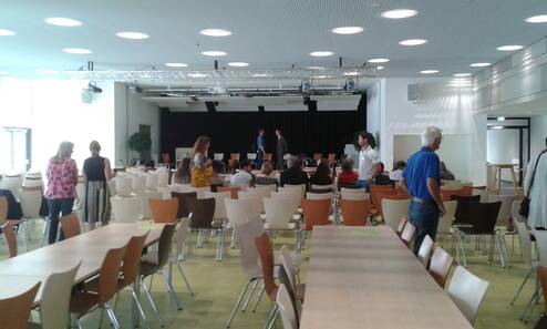 Nach einem Grußwort des Oberbürgermeisters blickte der verantwortliche Architekt Thomas Fischer noch einmal auf die einzelnen Bauphasen des Mensaprojektes zurück, dessen Ergebnis sich wirklich sehen lassen kann. Die Schülerinnen und Schüler haben die Möglichkeit in einem sehr modernen und lichtdurchfluteten Esssaal in aller Ruhe und Gemütlichkeit ihr Mittagessen einzunehmen.