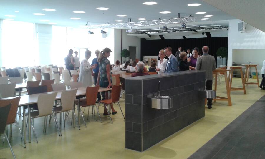 Bevor die Gäste zum kulinarischen Teil der Veranstaltung übergehen konnten – ein kaltes Buffet war von der Mensa-Cateringfirma Sodexo vorbereitet worden – sprach Frau Becker, Schulleiterin des Kurt-Schwitter-Gymnasiums, im Namen aller Schulleiterinnen und Schulleiter noch ein paar Dankesworte für die gelungene Fertigstellung des Mensagebäudes.