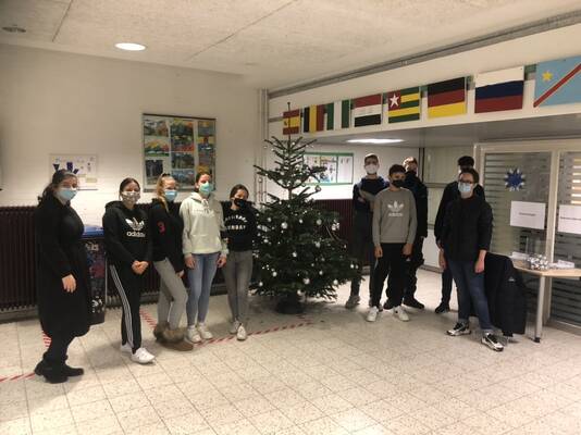 Auch in diesen besonderen Zeiten wollen wir nicht auf Traditionen verzichten, wie den geschmückten Weihnachtsbaum in der Pausenhalle. Die 10d hat dieses Mal die Aufgabe übernommen: Corona konform mit Mund/Nasen-Schutz.