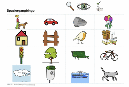 Immer, wenn ihr etwas vom Spielfeld auf eurem Weg seht, könnt ihr es abhaken. Wenn ihr in einer Reihe alle Bilder abgehakt habt, habt ihr ein Bingo. Das macht die Spaziergänge bestimmt interessanter.