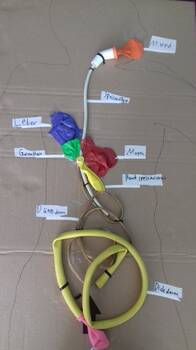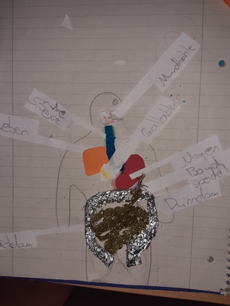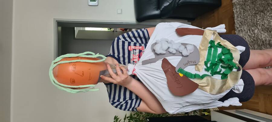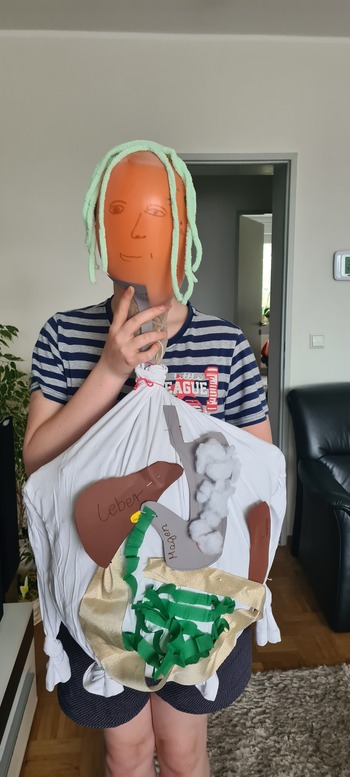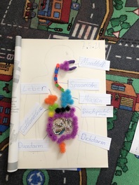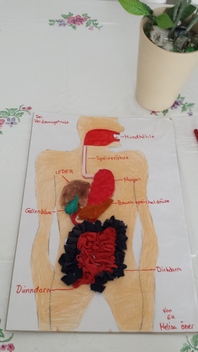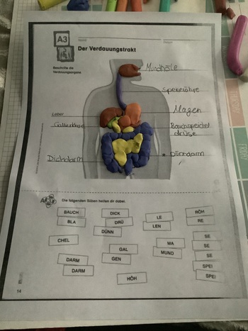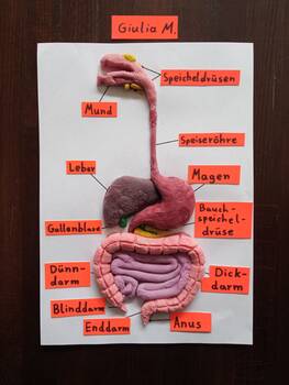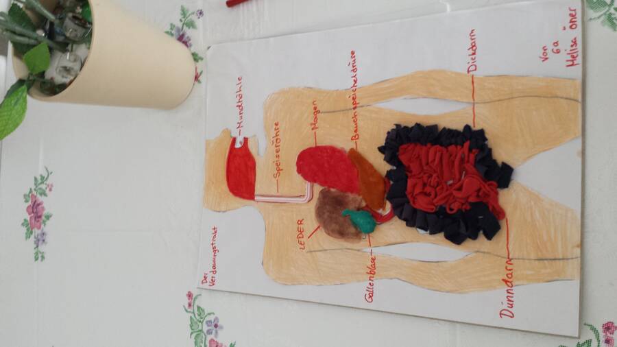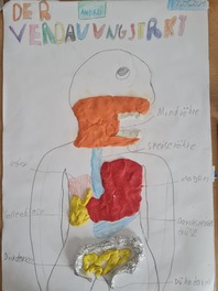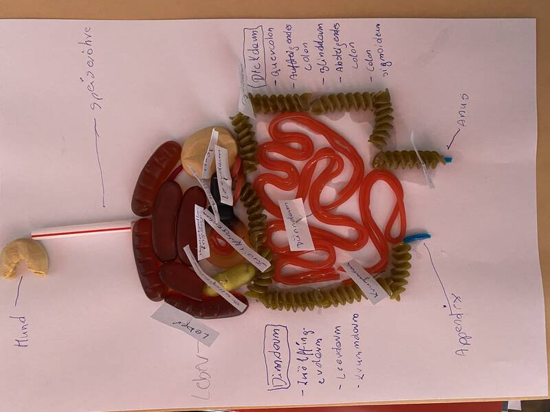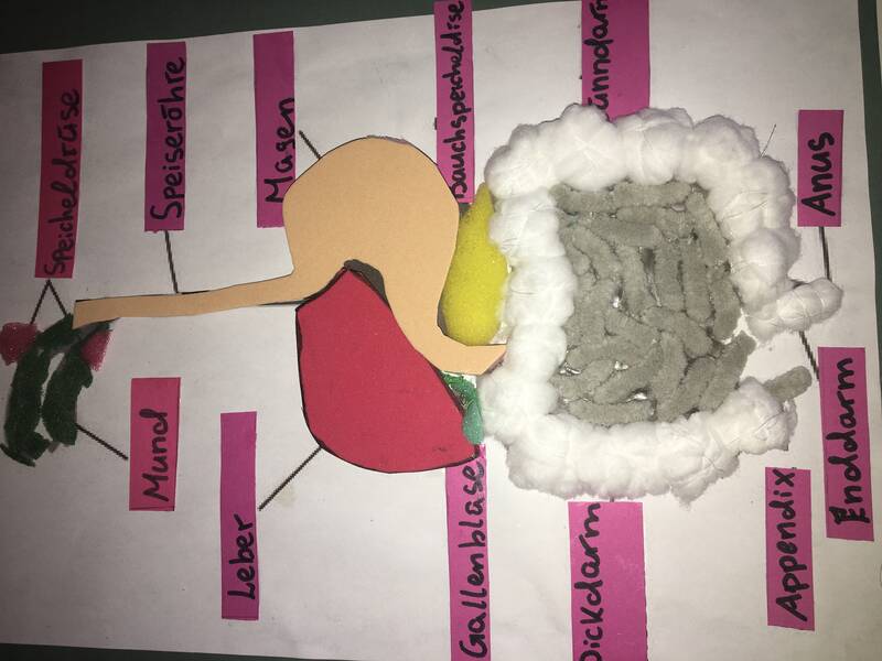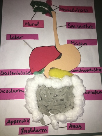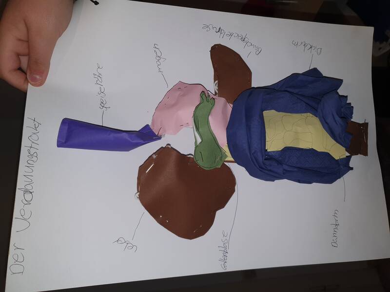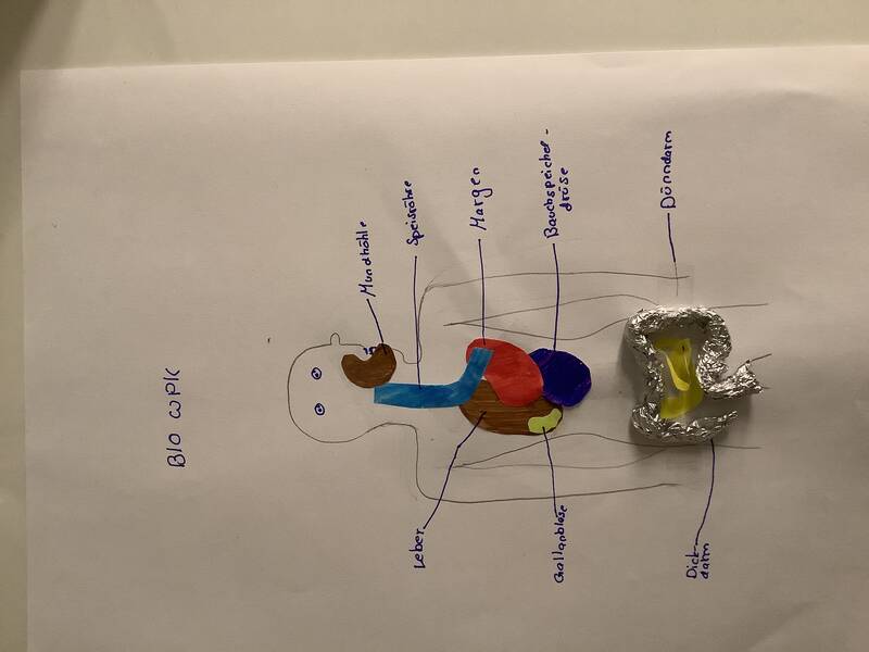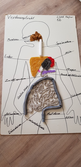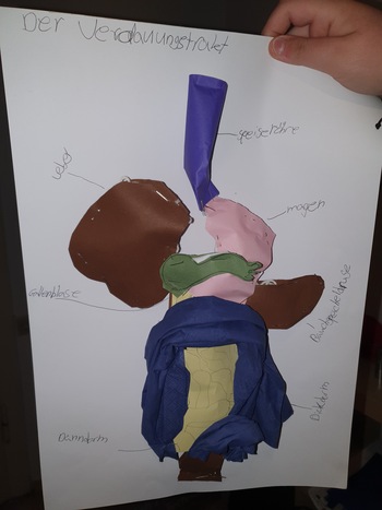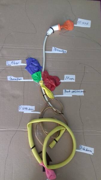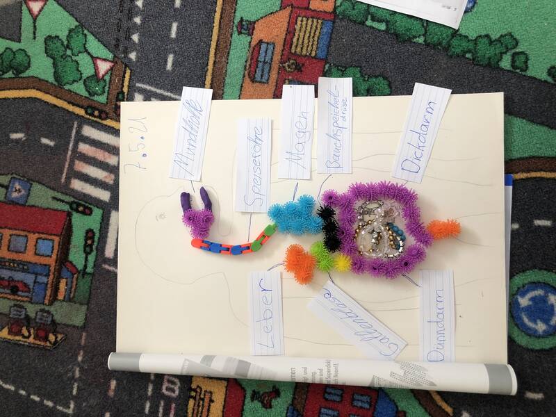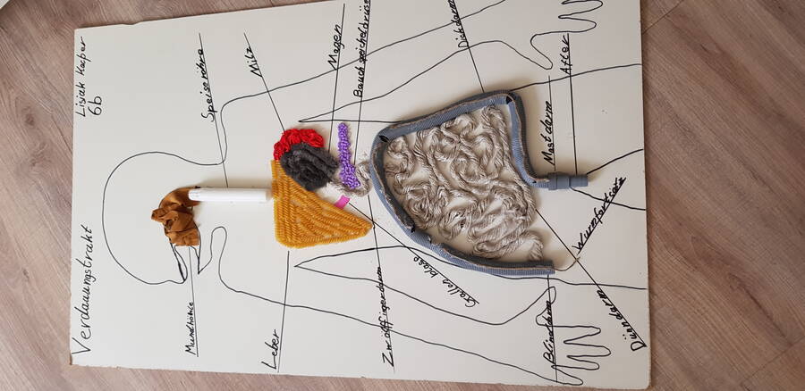 Eine Aufgabe der Schüler*innen war es, den Verdauungstrakt mit verschiedenen Materialien aus dem Haushalt als Model darzustellen. Durch diese haptische Vorgehensweise wird der Weg der Nahrung durch den Menschen oftmals leichter vorstellbar.