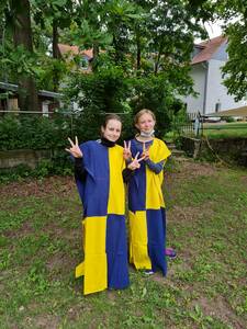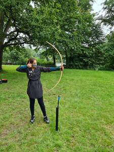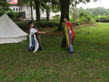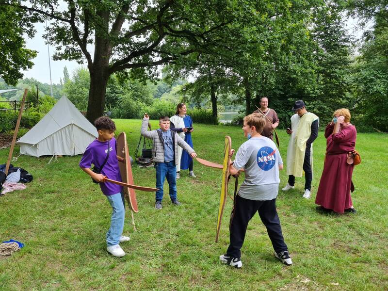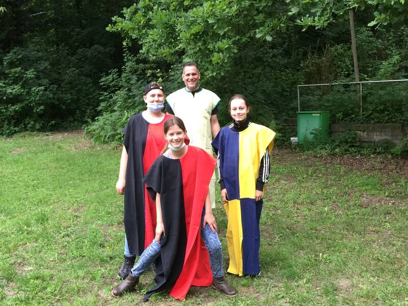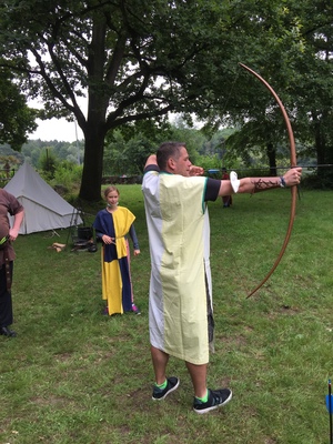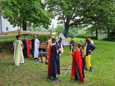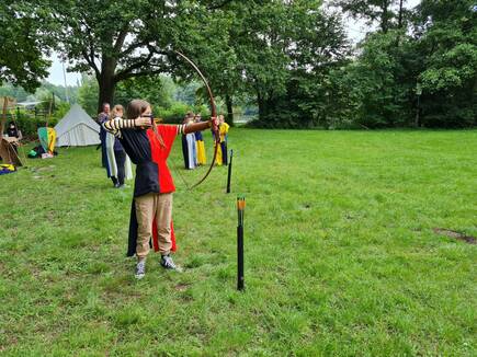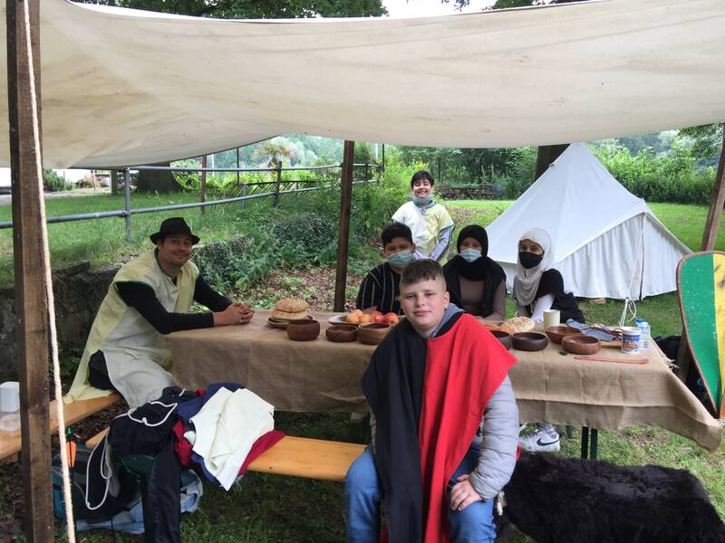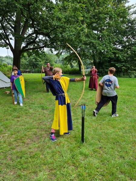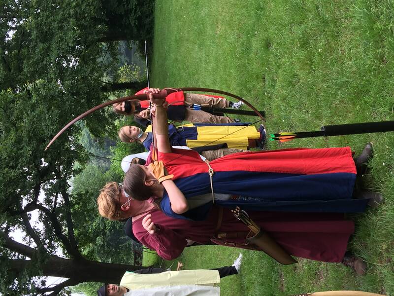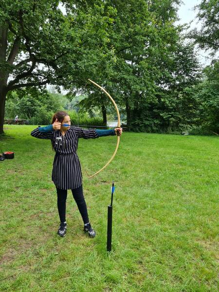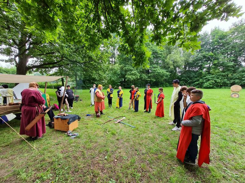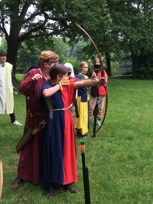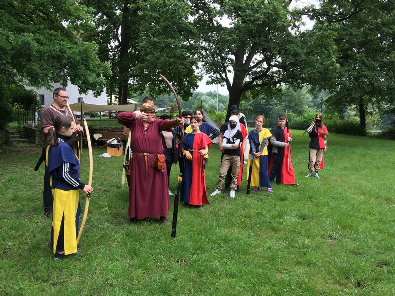 Kurz vor den Ferien besuchte die Klasse 6c mit ihrem Klassenlehrer Herrn Meißner, Frau Eberstein und Frau Nafe das Gelände der Naturfreunde Misburg. Dank der Organisation von Frau Eberstein empfingen sie dort mittelalterlich gekleidete Mitglieder der Mittelalter-Sparte und boten den Schülerinnen und Schülern Speis und Trank sowie die Unterweisung im Bogenschießen und Schwertkampf an. Frau Eberstein trug ebenfalls eine originalgetreue mittelalterliche Gewandung (siehe Fotos).