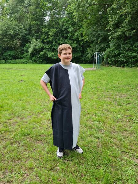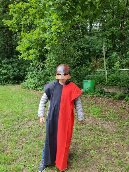 Zuerst wurde sich jedoch zeitgemäß angezogen. Die Schülerinnen und Schüler erhielten jeder einen mittelalterlichen Waffenrock. Dann wurde ihnen ausführlich über das Leben der Menschen im Mittelalter erzählt. Auf dem Feuer kochte schon ein Süppchen, dass die Schülerinnen und Schüler in ihrer Pause hungrig schlürften. Es schmeckte allen, denn der Topf war am Ende leer.