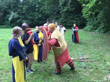 Dann kam der Schwertkampf mit Holzschwertern und Holzschildern zum Verteidigen. Die zuvor beschriebenen Techniken wurden dort sofort ausprobiert und es war sehr lustig mit anzusehen.