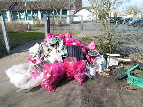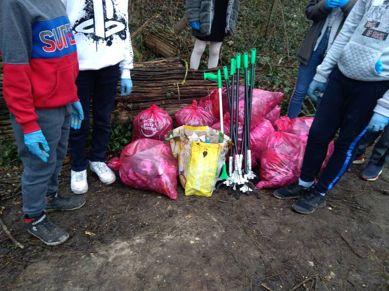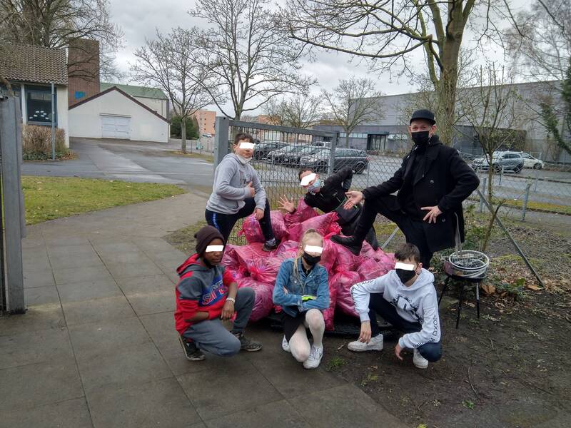 Vom 14. - 18. März 2022 sammelten die Schülerinnen und Schüler rund ums Schulgelände, wie z.B. im Steinbruch oder auf dem Fußweg zur Anderter Straße, viele Säcke Müll. Auch auf dem Schulgelände selbst kamen einige Säcke zusammen. Mit Müllzangen, Einmalhandschuhen und Müllsäcken ausgestattet gingen einzelne Schülergruppen sowie ganze Schulklassen auf die Suche nach Müll.