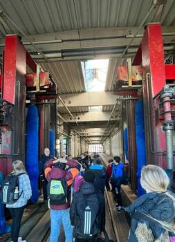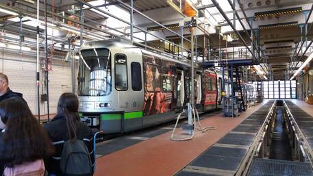 Als wir damit fertig waren, wurde uns noch die Werkstatt und die Straßenbahnwaschanlage gezeigt. In der Werkstatt wurde uns erklärt, dass die Bahnen hier repariert werden und dass die Gänge im Boden dafür da sind, dass man die Bahnen auch von unten reparieren kann. Es war sehr interessant, dass eine Straßenbahn 10 – 15 Minuten mit 6000 Liter Regenwasser gewaschen wird.