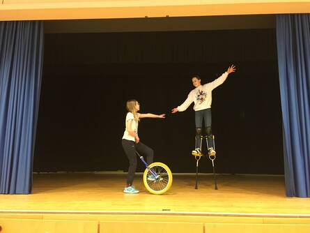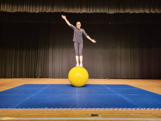 Im Zirkuskünsteangebot kannst du im großen Saal des Bürgerhauses Misburg einmal die Woche mit deinen Freunden trainieren wie im Zirkus . Du kannst das Stelzenlaufen ausprobieren , Einrad fahren , Balancieren auf Laufkugeln oder Rola Bola , das Pyramiden bauen und Akrobatische Elemente erlernen oder mit vielen verschiedenen Zirkusutensilien jonglieren ( Bälle , Teller , Ringe , Keulen , Hula Hoop usw. ) .
