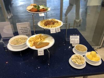Die andere „Mensa“-Gruppe hat sich die Mensa oben angeschaut. Dort können 1500 Personen gleichzeitig an Tischen sitzen und essen. Es gibt 4 Stationen und ein Salatbuffet, wo man sich Mittagessen holen kann. Es gibt auch eine Dessert-Station. An drei Kassen kann man das Essen bezahlen. Nur an einer kann man mit Bargeld bezahlen, an den anderen Kassen braucht man eine Chipkarte. Am Eingang der Mensa waren auf einem Tisch die Tagesgerichte aufgebaut. An der Geschirrrückgabe gibt es einen Fahrstuhl, der transportiert die Tabletts mit dem dreckigen Geschirr in den hinteren Küchenbereich.