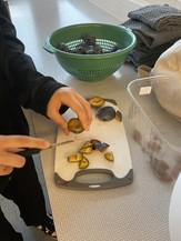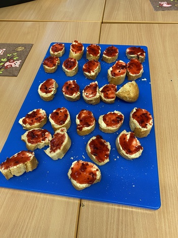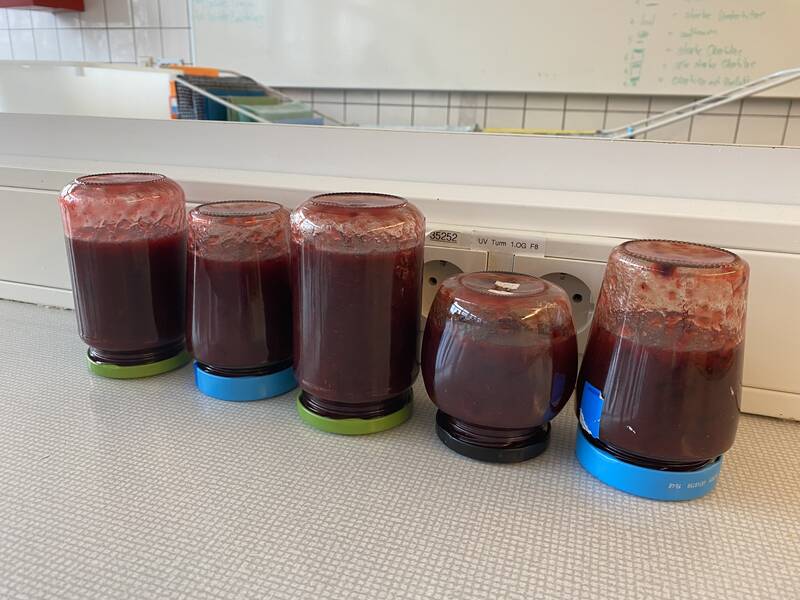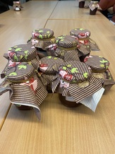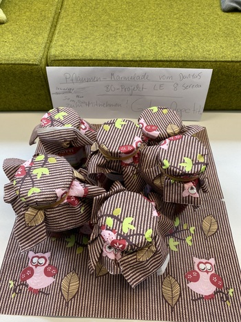 Am ersten Tag haben wir Marmelade in der Küche gemacht. Zuerst haben wir das Rezept für Pflaumenmarmelade gelesen und eine Einkaufsliste erstellt. Dann haben wir die Zutaten im Supermarkt gekauft. Zurück in der Küche mussten die Arbeitsplätze vorbereitet werden. Die Pflaumen wurden abgespült und in Würfel geschnitten. Alle Zutaten wurden im Kochtopf zu Mus gekocht. Die heiße Marmelade haben wir in Gläser gefüllt. Wir konnten die fertige Marmelade probieren – lecker! Abschließend wurde jedes Glas mit Serviette und Gummiband dekoriert. Wer wollte konnte ein oder zwei Gläser mit nach Hause nehmen. Die restlichen Gläser haben wir im Lehrerzimmer aufgestellt. Zum Schluss haben wir die Küche aufgeräumt und sauber gemacht.