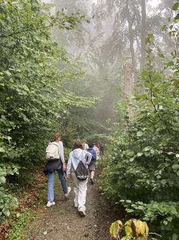 Von dort wanderten sie durch den Nebel immer bergauf. Oben auf dem Burgberg hatte sich der Himmel schließlich aufgeklärt und es wurde eine Pause gemacht. Im Anschluss an die Pause gab es dann eine Schnitzeljagd und die Schülerinnen und Schüler mussten die Umgebung auf dem Burgberg erkunden.