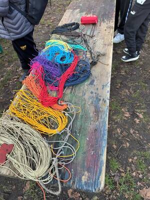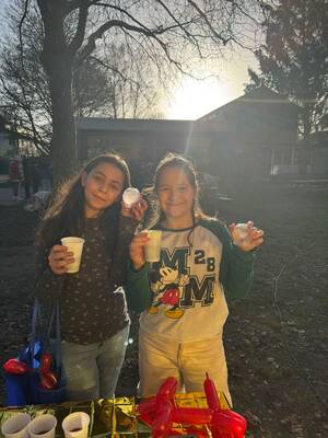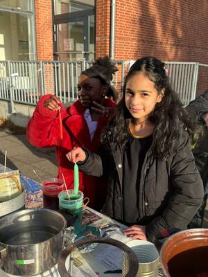 Für weitere Unterhaltung sorgte ein Hufschmied und seine Frau, die mit den Schülerinnen und Schülern Hufeisen und Schmuckstücke aus Leder herstellten. Herr Pietschmann und Herr Heller boten den Kindern Bewegungsspiele an und diejenigen, die sich draußen ein wenig aufwärmen wollten, holten sich einen Kinderpunsch bei unserer Sozialarbeiterin Frau Feyerabend und setzten sich an Herrn Kosters Lagerfeuer. Wer Lust hatte, konnte sich hier auch ein paar Marshmallows über dem Feuer grillen.