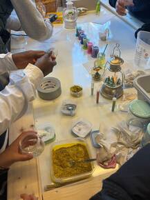 Kreativ ausleben konnten sich die Schülerinnen und Schüler auch beim Kerzenziehen bei Frau Mattern oder beim Weihnachtsbaumschmuck oder Winteranhänger Basteln bei Frau Franz oder indem man sich seine eigene Schneekugel bei Frau Nafe zusammenstellte.