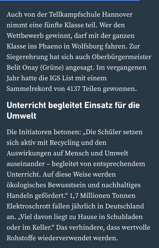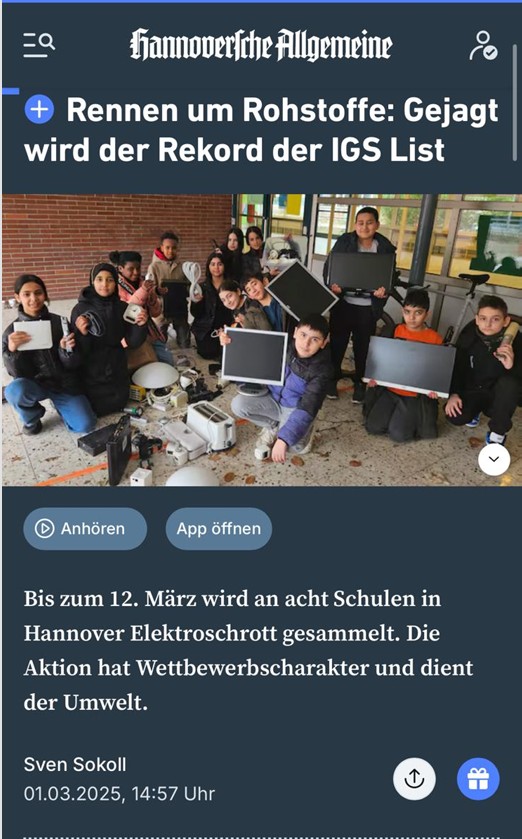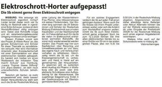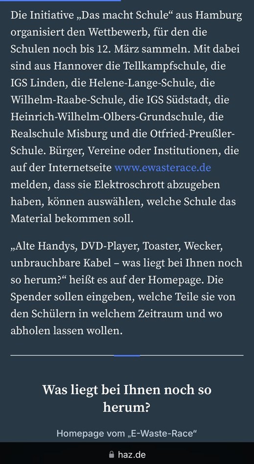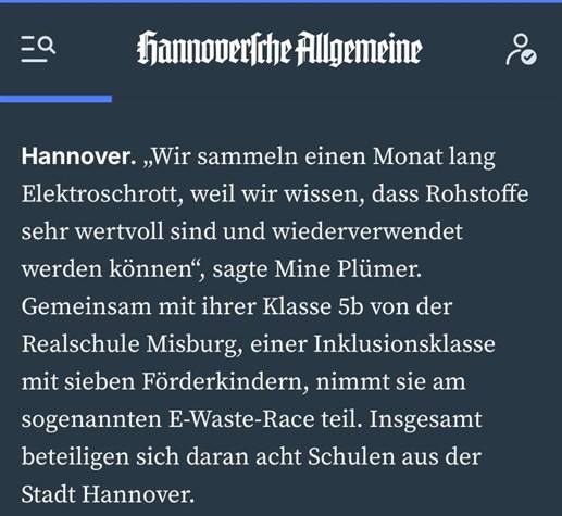 Das E-Waste Race Projekt nähert sich dem Abschluss. Hier ein Pressespiegel zu dem Projekt und ihren Teilnehmer*innen: Frau Plümer und ihre Inklusionsklasse 5b.