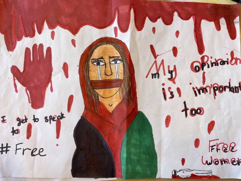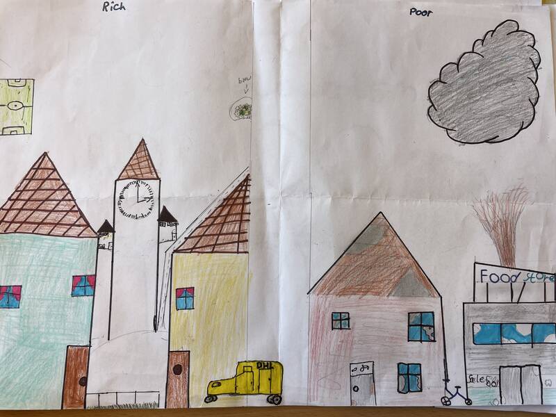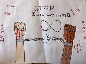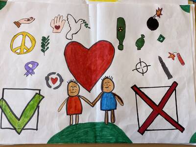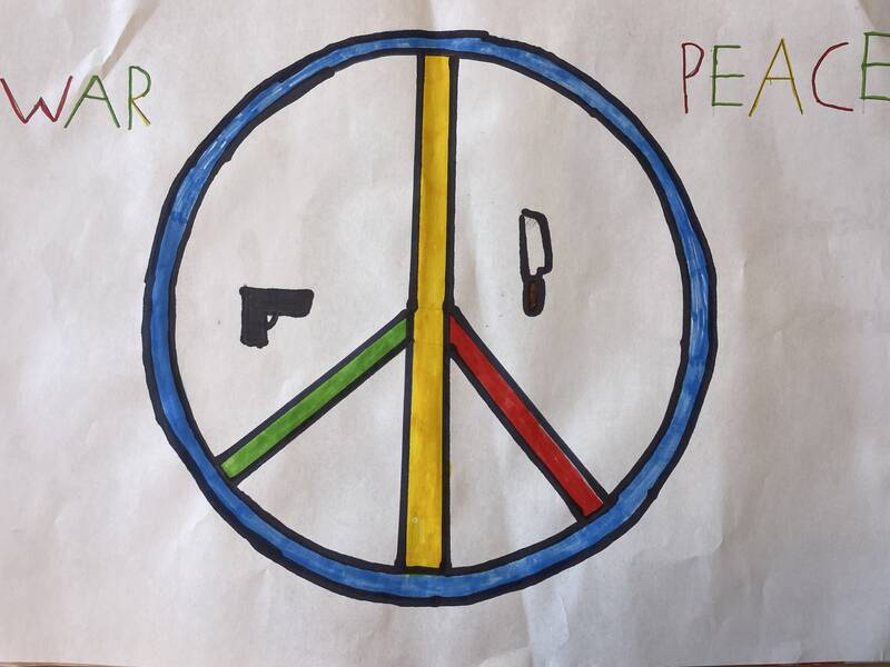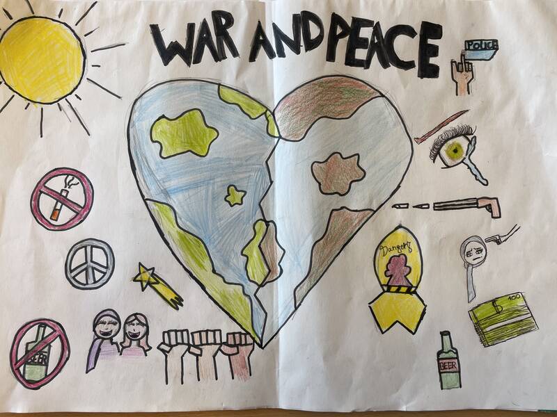 In einer der nächsten Stunden haben die Schüler und Schülerinnen in Kleingruppen eigene murals zu verschiedenen Themen entworfen und der Klasse präsentiert. Die ausgesuchten Themen waren u.a. arm/reich, Liebe/Hass, Krieg/Frieden.
