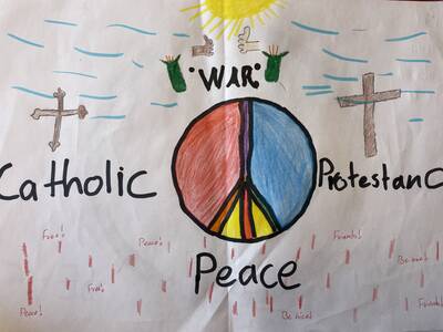 Im Rahmen des Englischunterrichts der 7c geht es in der aktuellen Unit "Northern Ireland" um sog. "murals" (Wandbilder) im Bezug auf die Unruhen zwischen Katholiken und Protestanten. Über die Unruhen - "The Troubles" - haben wir ausführlich gesprochen und sogar eine kurze Dokumentation auf Englisch angesehen.