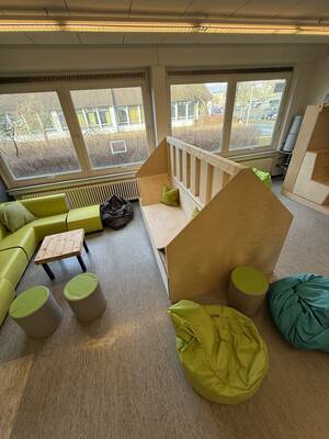 Im Rahmen eines praxisorientierten Projekts mit der FUNTASIEWERKSTATT gestalteten Schüler*innen der 7. bis 9. Klassenstufe eine eigene Sitz-Liege-Lounge aus Paletten. In nur zwei Unterrichtsstunden entstand mit handwerklichem Geschick und viel Teamarbeit ein funktionaler Raumtrenner, der nun zum Verweilen und Lernen einlädt.