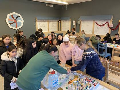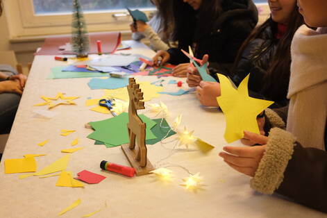Auch im Innenbereich hatten wir alle Hände voll zu tun: Es galt Schneekugeln zu gestalten und zu befüllen, Weihnachtskarten und Fensterbilder zu basteln, Kerzen zu verzieren und Donuts, Waffeln, Plätzchen und allerlei Köstlichkeiten aus aller Welt zu essen.