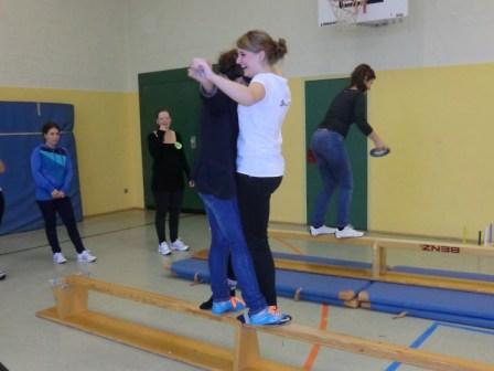 In der Sporthalle durften wir Gleichgewichtsübungen nach Anleitung der Auszubildenden selbst durchführen. Zu den Übungen gehörten: