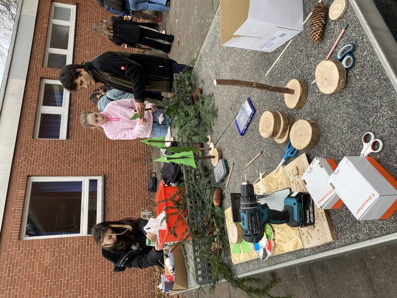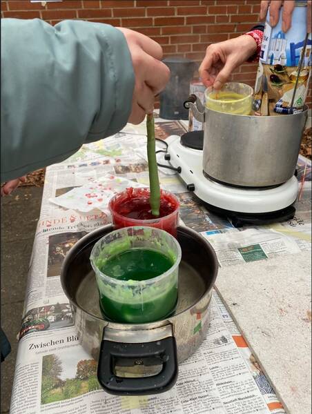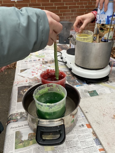 Auch dieses Jahr fand am letzten Schultag ein Winterfest für den 5. und 6. Jahrgang statt. Dabei gab es im Freizeitbereich und auf dem Pausenhof viel zu entdecken und zu tun. Wir konnten mit Leder arbeiten und Metall schmieden, das erforderte Geschick und Kraft zugleich. Bei Frau Mattern konnten wir eigene Kerzen ziehen und nebenan bei Herrn Koster und Herrn Everding entweder Marshmallows über dem Feuer rösten oder unser Geschick mit dem Hammer beim Nägel versenken unter Beweis stellen.