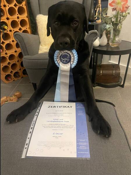 In der RSM ist Oreo ja schon als Begleiter im Unterricht von Frau Heide bekannt - hier präsentiert er stolz sein Zertifikat als Schul- und Begleithund.