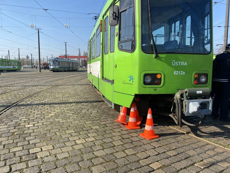 Auf dem Betriebsgelände gab es einige Stadtbahnen zu sehen. Doch was macht eigentlich der Sand in der Bahn? Bei einem Notfall bremst das Fahrzeug am schnellsten mit Sand ab, der durch die Auslösung des Notfalls in einem Waggon auf die Schienen fällt. Daraufhin das Highlight: Alle Mann rein in die Bahn zur Notfall-Bremsfahrt, toll !!