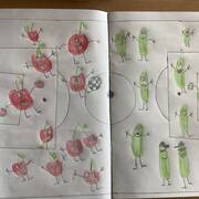 Im Kunstunterricht hat die Klasse 5a das Thema Farbenlehre. Am letzten Schultag vor den Osterferien haben die Schülerinnen und Schüler mit dem Komplementärkontrast experimentiert und aus dem Bereich Obst und/oder Gemüse Fußballmannschaften aufgestellt, die gegeneinander antreten.